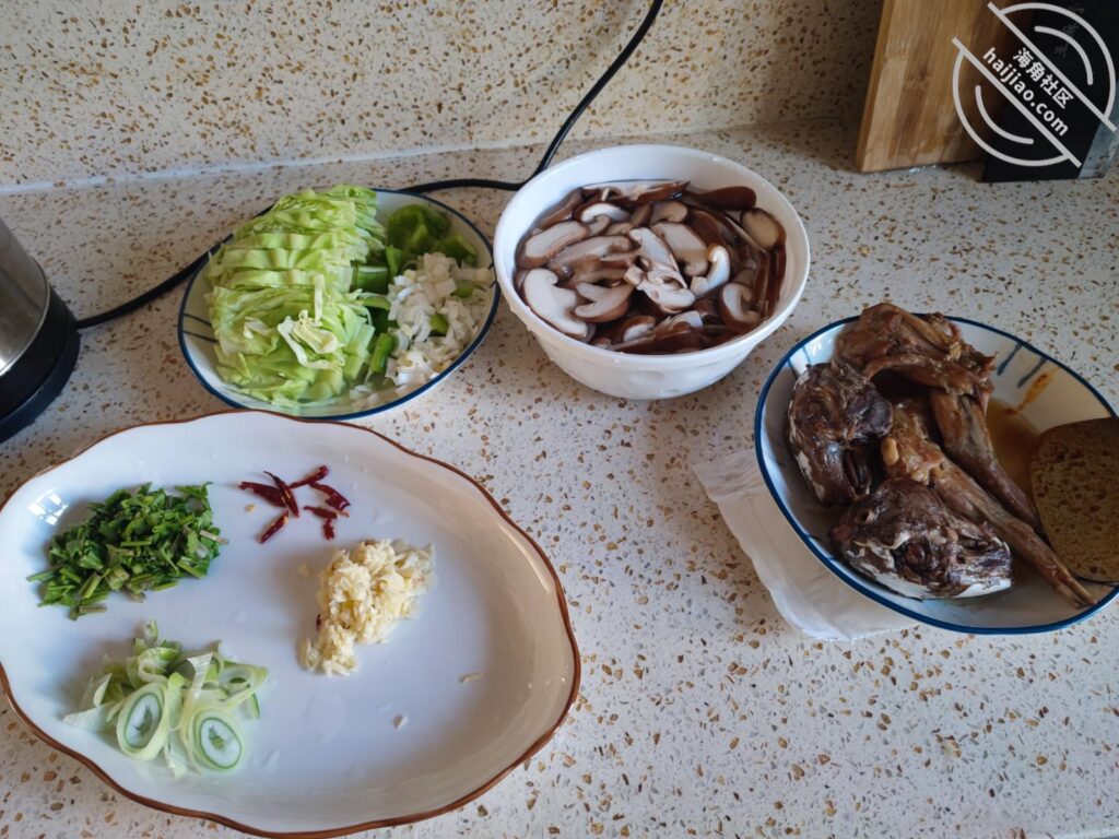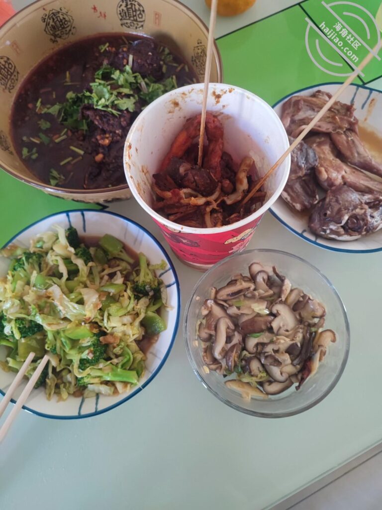 当当当当~!就我和妈妈,所以也不讲究几个菜了,一个麻辣兔头兔腿,一个五香兔头兔腿,一个外卖炸串,一个我炒的西兰花包菜,一个我炒的素炒香菇片,怎么样?我这厨艺还不错吧~